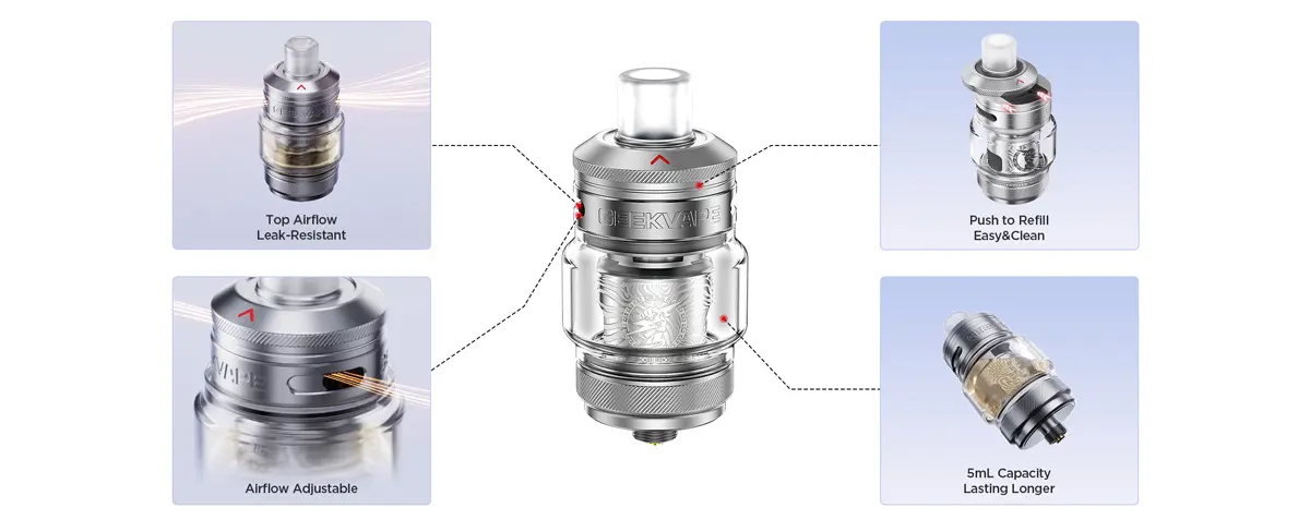 Designul cu airflow superior reduce semnificativ riscul de scurgeri. Lichidul nu ajunge la orificiile de aer în condiții normale de utilizare, chiar și cu atomizorul înclinat sau transportat în buzunar. Scurgerile pot apărea doar în situații extreme sau dacă rezistența nu este montată corect.