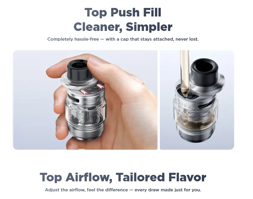 | Sistem de umplere top push-to-fill, rapid și curat, cu capac care rămâne prins de atomizor și nu se pierde. | Este un atomizor strict DL, nu este potrivit pentru vaperii care preferă MTL sau lichide cu nicotină mare. |