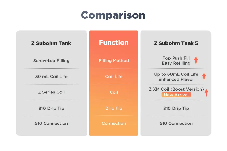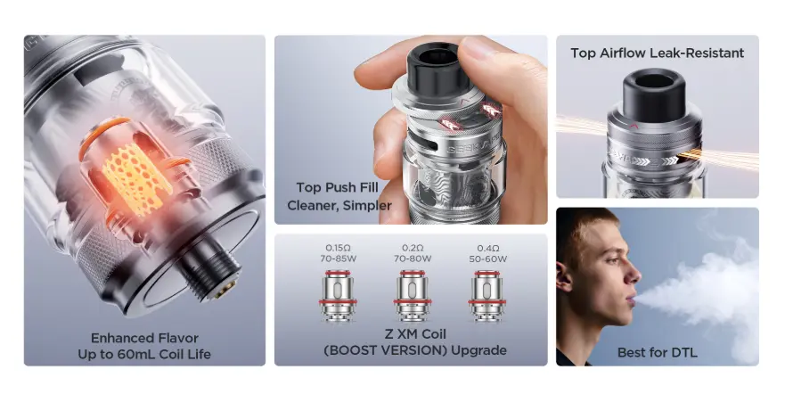 | Rezistente Z XM (Boost Version) cu durată de viață extinsă, optimizate să reziste până la aproximativ 60 ml lichid, în funcție de lichid. | Consum mai mare de lichid comparativ cu atomizoarele MTL, datorită fluxului de aer ridicat și wattajului mai mare. |