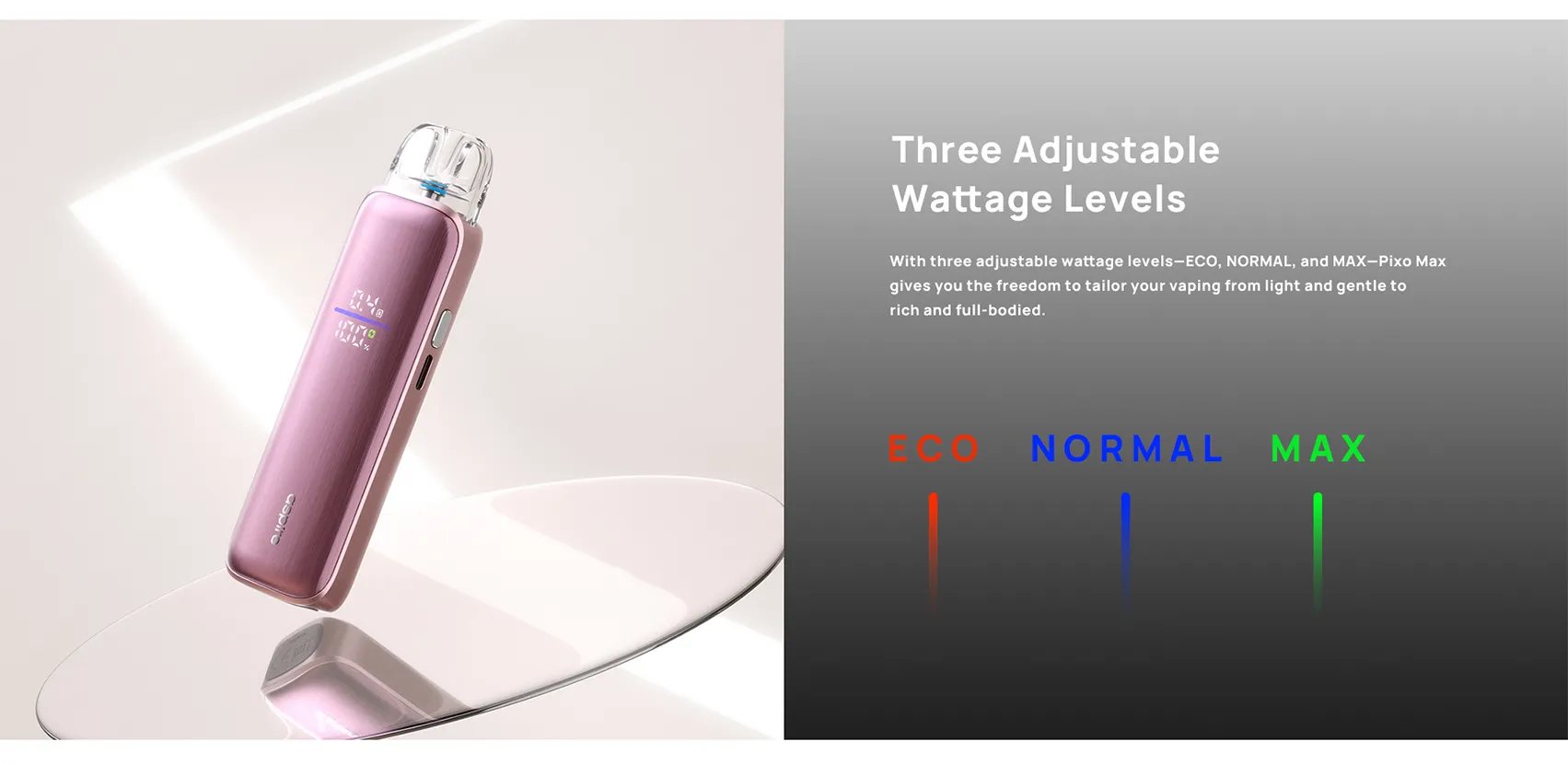 - Moduri de funcționare: ECO, NORMAL, MAX cu indicare LED colorată