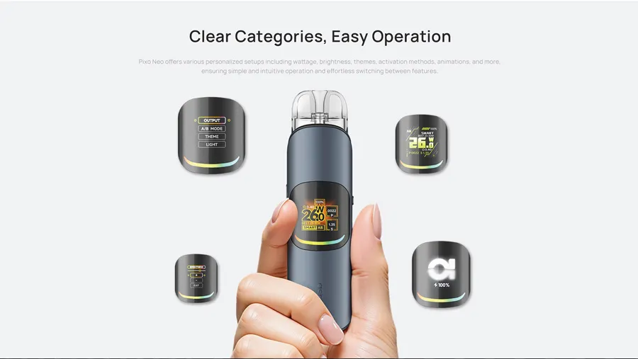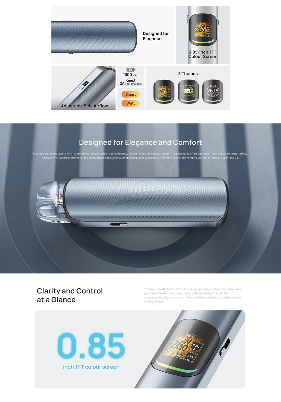 Aspire PIXO NEO este o evoluție impresionantă a seriei PIXO, aducând tehnologia avansată într-un format compact și elegant. Ecranul TFT color de 0.85″ este o caracteristică remarcabilă care oferă control total asupra experienței de vapit, iar cele 3 teme și animații personalizabile adaugă un plus de stil.