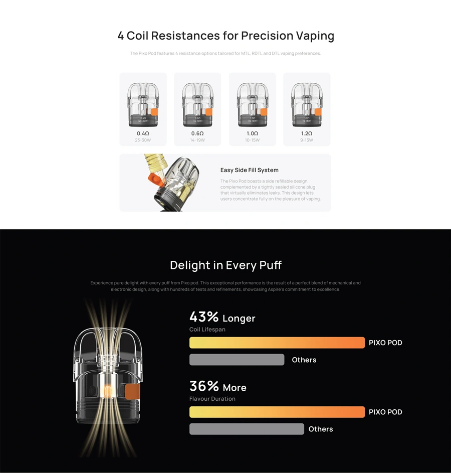 - Rezistențe compatibile (capsule Aspire Pixo vândute separat): 0,4 Ω, 0,6 Ω, 1,0 Ω, 1,2 Ω, cu intervale de putere dedicate fiecărei variante.
