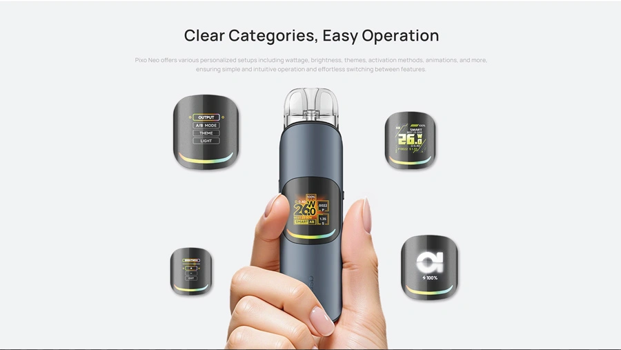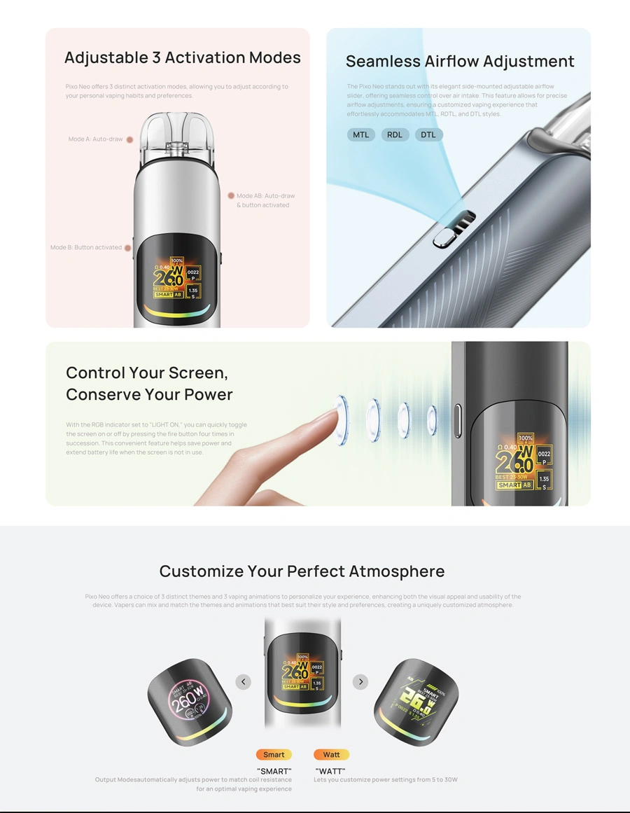 Dispozitivul este compatibil cu întreaga gamă de capsule Aspire Pixo, în variantele de 0,4 Ω, 0,6 Ω, 1,0 Ω și 1,2 Ω, disponibile atât în versiuni de 2 ml (TPD), cât și de 3 ml. În pachetul standard al Kit Aspire Pixo Neo Red găsești de regulă o capsulă de 0,4 Ω pentru RDL/DL și una de 1,0 Ω pentru MTL, astfel încât poți testa încă de la început două stiluri diferite de vaping.