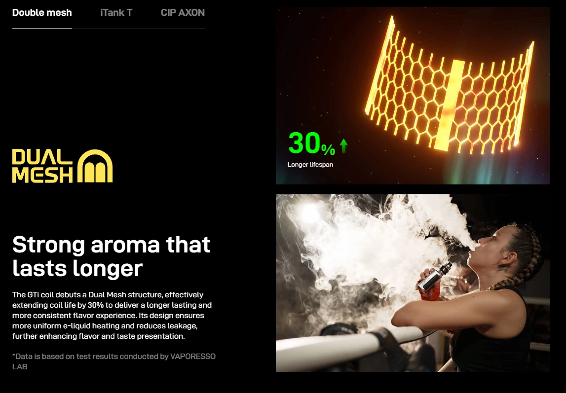 Atomizorul iTank T din Kit Vaporesso Armour Ultra Obsidian Black este compatibil cu toată platforma de rezistente Vaporesso GTi, inclusiv versiunile GTi Dual Mesh. În pachet sunt incluse două rezistente: GTi 0,2 Ω Dual Mesh (60–75 W) și GTi 0,4 Ω Dual Mesh (50–60 W), acoperind majoritatea preferințelor DL / RDL.