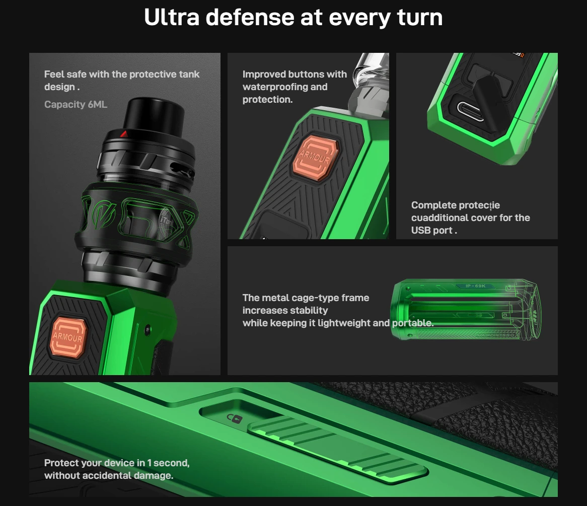 Kit Vaporesso Armour Ultra Obsidian Black este certificat IP68 / IP69K și MIL-STD-810H, ceea ce înseamnă că a fost proiectat să reziste la apă (până la 1 m, 30+ minute), jeturi de apă la presiune/temperatură ridicată și căderi de până la 1,2 m, în anumite condiții de testare. Totuși, nu este indestructibil: șocurile extrem de puternice, expunerea repetată la condiții dure sau utilizarea necorespunzătoare pot afecta în timp integritatea dispozitivului, deși este mult mai robust decât un kit obișnuit.