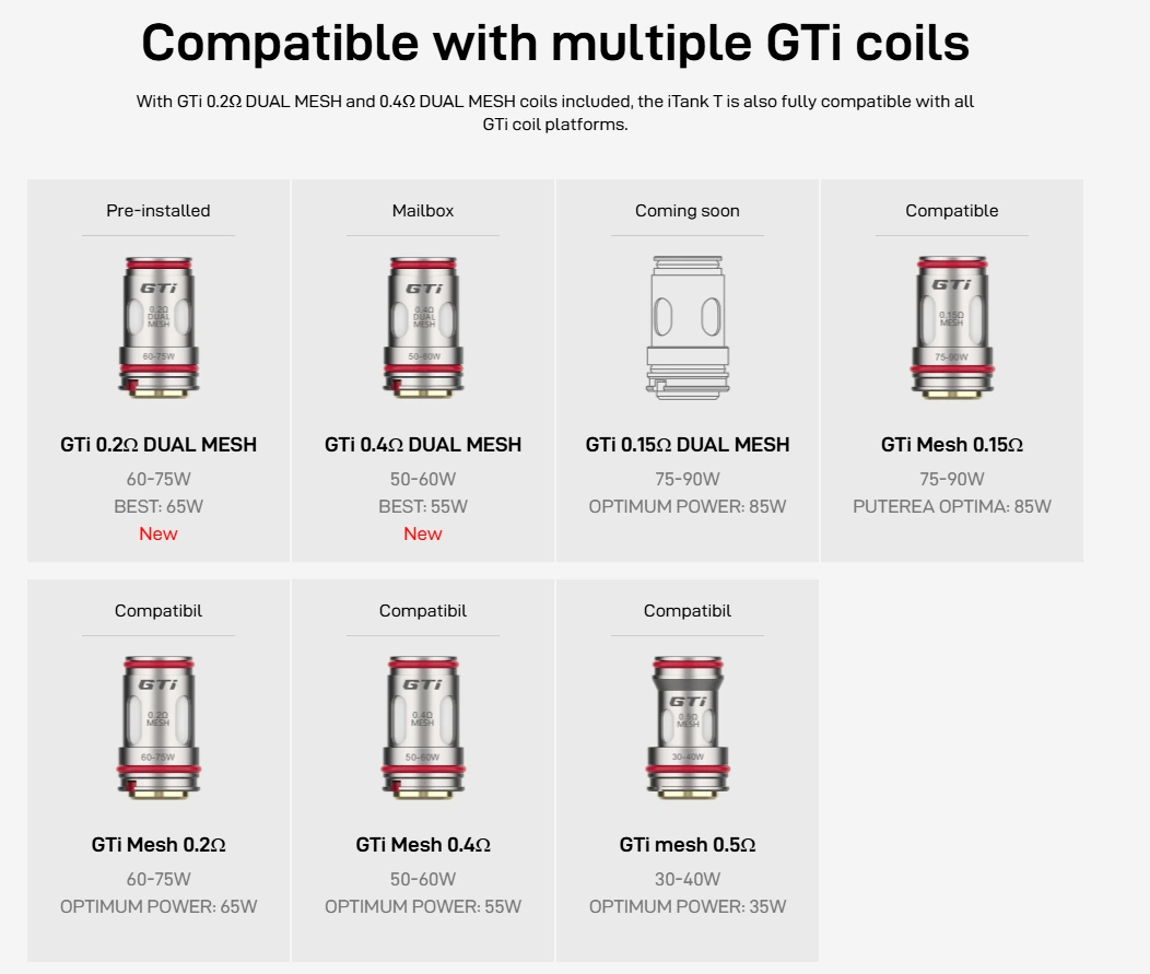 - Rezistente incluse în pachet: GTi 0,2 Ω Dual Mesh (recomandat 60–75 W, DL) si GTi 0,4 Ω Dual Mesh (recomandat 50–60 W, DL / RDL)