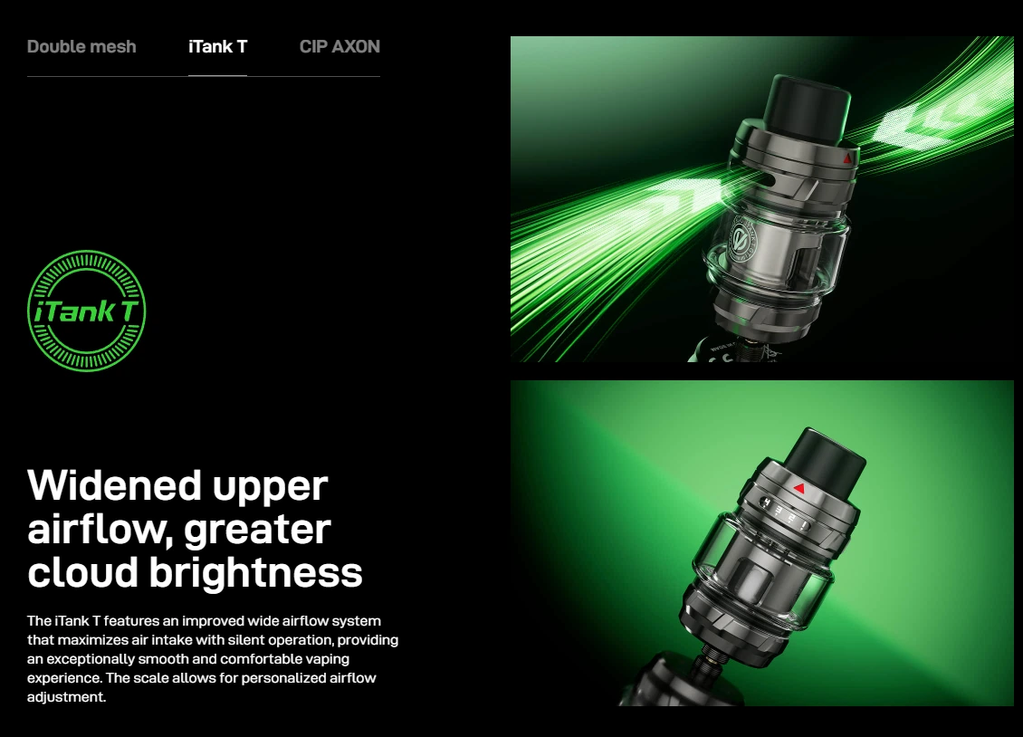 | Atomizor iTank T de 6 ml cu airflow superior și sistem de umplere top-fill culisant, practic și cu risc redus de scurgeri. | Capacitatea de 6 ml și dimensiunile atomizorului îl fac un kit mai voluminos; nu este cea mai discretă opțiune pentru vapat „low-profile”. |